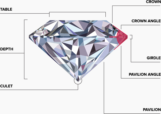 Much like the crown angle, the pavilion affects sparkle and brilliance. When cut properly, the pavilion will emit the most sparkle through the top of the jewel. Cutting too shallow limits sparkle and makes the diamond seem glasslike. If the angle is too large the diamond will not emit optimal sparkle.